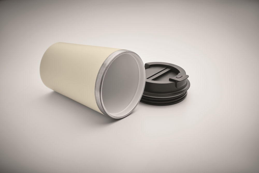 Dvoustěnný pohárek s vnější stěnou z PP a vnitřní stěnou z recyklované nerezové oceli (90 % recyklované nerezové oceli a 10 % nerezové oceli) s keramickou vrstvou. Neteče. Objem: 350 ml. Rozměry: O 8,5 x 14 cm