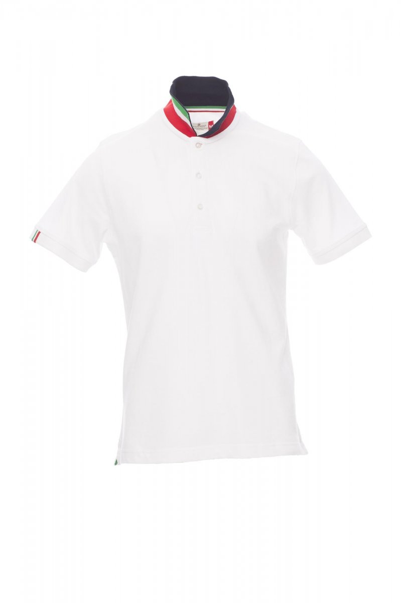 Pánská polokošile s krátkým rukávem s 3 barevně sladěnými perleťovými knoflíky, barevně sladěný límeček s kontrastním rubem v barvách italské vlajky, který je vidět pouze při zvednutí, barevně lemovaný pravý rukáv ve stejné barvě jako límeček, žebrovaný límeček a lemy rukávů, postranní rozparky v barvách italské vlajky, skryté prošití límečku s žerzejovým úpletem rovněž v barvách vlajky, postranní vyztužovací páska, tvarovaná výztuž na spodní straně límečku.