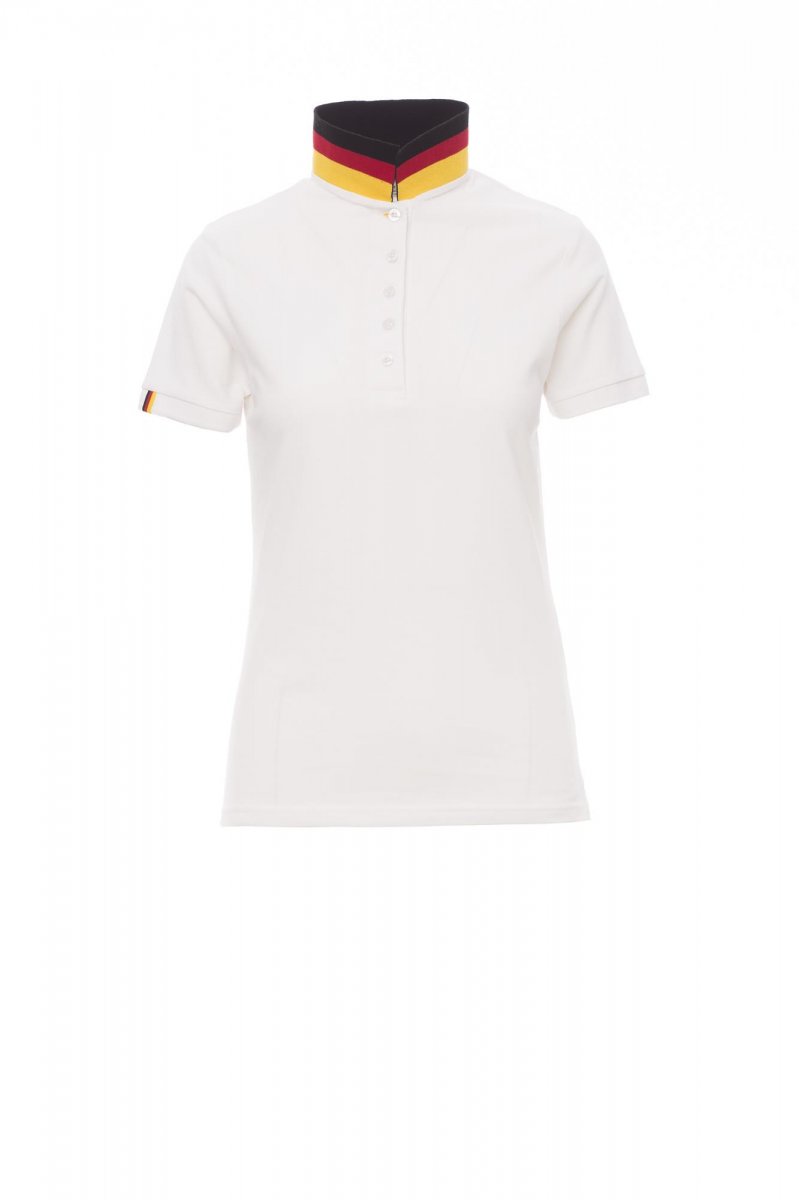 Dámská vyštíhlená polokošile s krátkým rukávem s 5 barevně sladěnými perleťovými knoflíky, barevně sladěný límeček s kontrastním rubem v barvách italské vlajky, který je vidět pouze při zvednutí, barevně lemovaný pravý rukáv ve stejné barvě jako límeček, žebrovaný límeček a lemy rukávů, postranní rozparky v barvách italské vlajky, skryté prošití límečku s žerzejovým úpletem rovněž v barvách vlajky, postranní vyztužovací páska, tvarovaná výztuž na spodní straně límečku.
