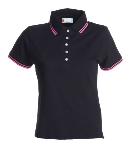 Dámská polokošile s krátkým rukávem a kontrastním lemem na rukávech a límci, 2 bílé knoflíky, vypasovaný střih, boční rozparky, 100% česaná bavlna, 210 g/m2. Doporučená technologie tisku: sítotisk S3, S4, výšivka.