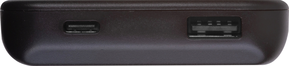Powerbanka (10 000 mAh) z recyklovaného plastu se dvěmi porty: USB-C in/out 5V/2,1A a USB-A out 5V/2,1A. Obsahuje 50 cm nabíjecí kabel. Rozměry: 13,5 x 6,5 x 1,5 cm