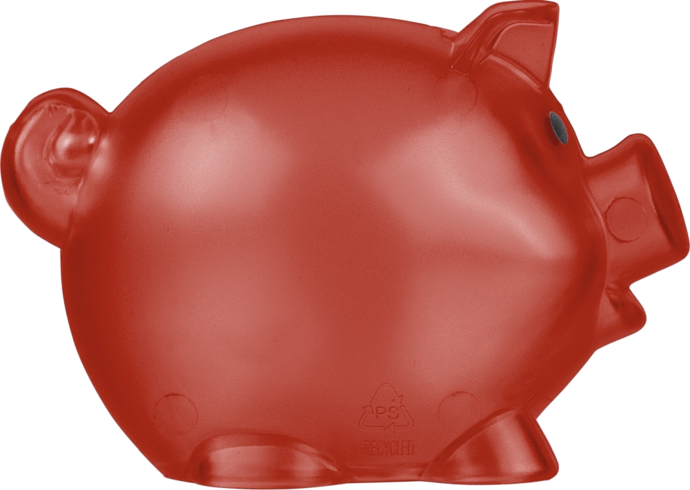 Recyklovaná plastová pokladnička ve tvaru prasete. Průhledná verze s recyklovaným logem na zadní straně. Rozměry: 7,1 cm x 9,5 cm