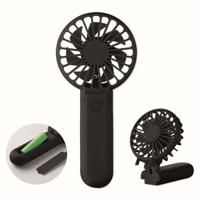 Přenosný skládací ventilátor z ABS plastu se 3 rychlostmi. Lze použít jako ruční nebo stolní ventilátor. Součástí balení je 1 vyměnitelná a dobíjecí 14500 lithiová baterie s kapacitou 500 mAh. Rozměry: 8 x 17.2 x 2.7 cm