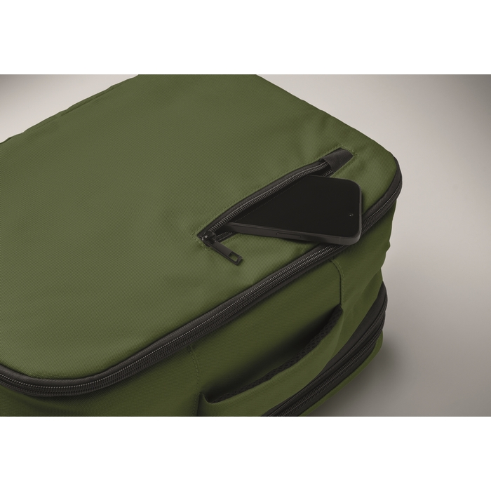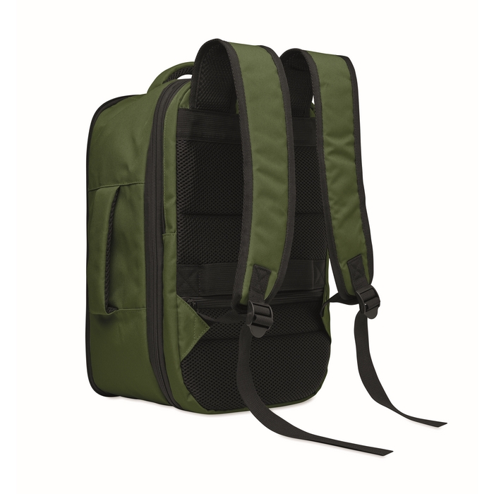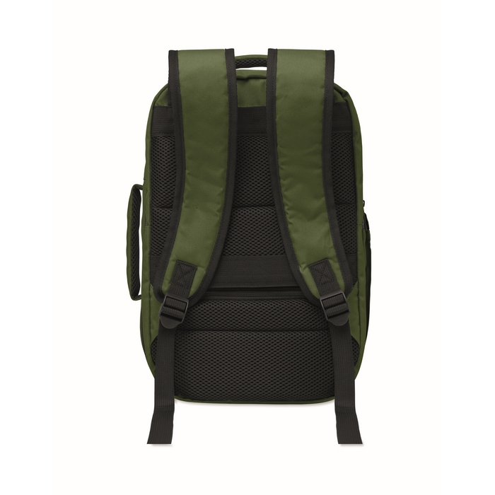 Kabinový batoh vyrobený z polyesteru 600D RPET s otevíráním pod úhlem 180o. Hlavní přihrádka se dvěma otevřenými oddíly, polstrovaná kapsa na 15 notebook a popruh na zavazadlo. Rozměry: 25 x 20 x 40 cm