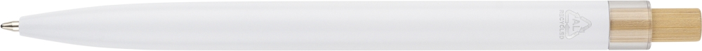 Propiska z recyklovaného hliníku s lakovaným tlačítkem, lemováním z rPET a kovovým klipem. S gravírovaným logem z recyklovaného materiálu. Přibližná délka psaní 700 metrů. Modrý inkoust. Rozměry: 1 cm x 14 cm x 1,34 cm.