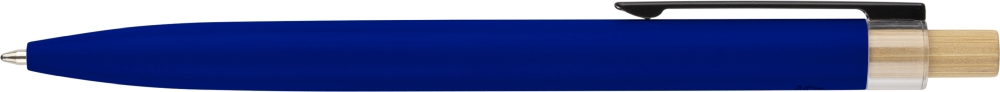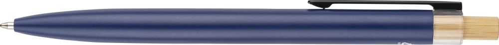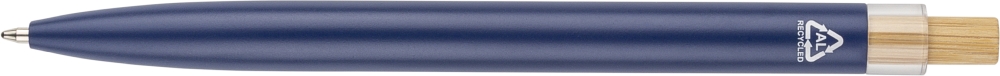 Propiska z recyklovaného hliníku s lakovaným tlačítkem, lemováním z rPET a kovovým klipem. S gravírovaným logem z recyklovaného materiálu. Přibližná délka psaní 700 metrů. Modrý inkoust. Rozměry: 1 cm x 14 cm x 1,34 cm.