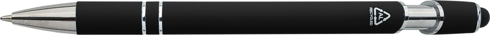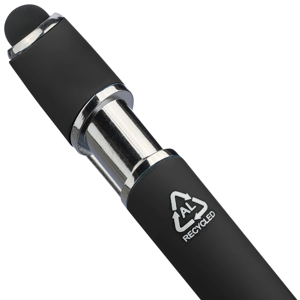 Propiska z recyklovaného hliníku s jednobarevným tělem s pogumovanou úpravou a černým kapacitním dotykovým stylusem. Design se stříbrnými akcenty, tlačítkem a černým inkoustem. Na těle je vyryté recyklované logo. Rozměry: 1,1 x 1,4 x 14,3 cm