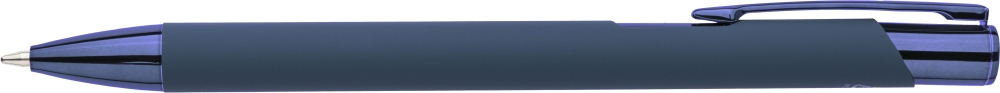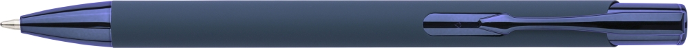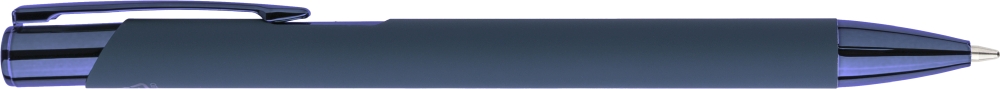 Propiska z recyklovaného hliníku s pogumovaným povrchem a sladěnými plastovými a kovovými detaily s UV vrstvou. Po gravírování se objeví lesklý zrcadlový efekt. S gravírovaným logem z recyklovaného materiálu. Modrý inkoust. Rozměry: 1 cm x 1,3 cm x 13,8 cm.