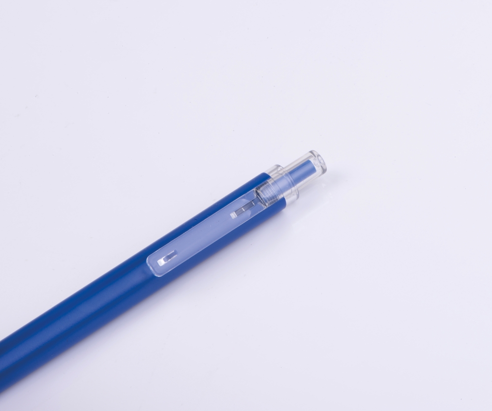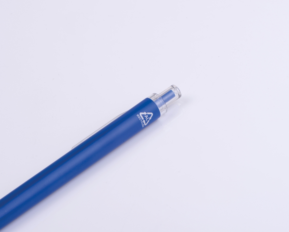 Propiska z recyklovaného hliníku a plastu s průhledným klipem a modrou inkoustovou náplní. Rozměry: o 1 x 14,2 cm
