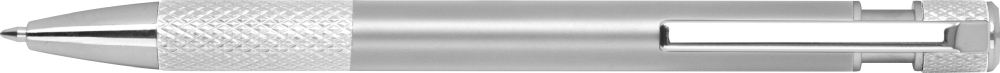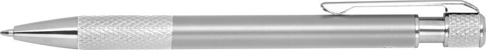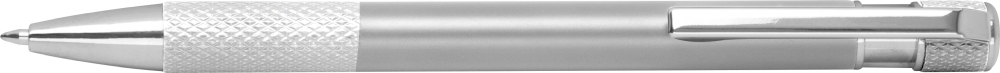 Propiska z recyklovaného hliníku se vzorovaným úchopem, tlačítkovým mechanismem a modrou náplní. Rozměry: o 1 x 14,2 cm