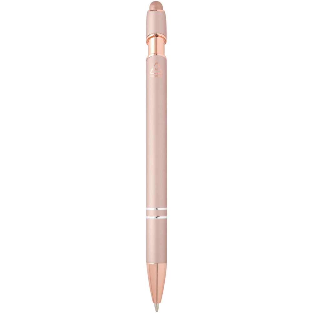 Propiska s povrchovou úpravou z růžového zlata má tělo vyrobené z recyklovaného hliníku a dotykový stylus vyrobený ze silikonu. Snižuje také množství odpadu na skládkách a pomáhá šetřit přírodní zdroje s cílem snížit emise skleníkových plynů. Barva inkoustu: Modrá. Délka psaní: 800 metrů. Rozměr hrotu: 1,0 mm. Rozměry: 14,4 x O 1 cm