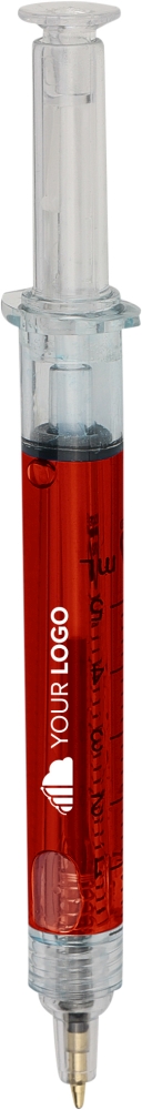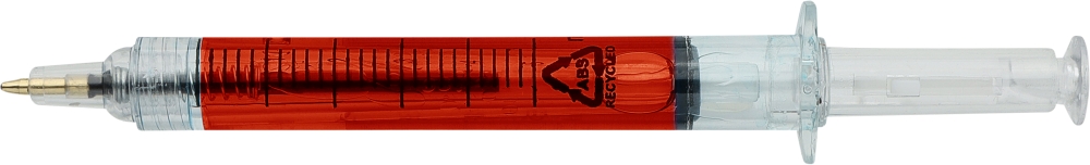 Propiska ve tvaru injekční stříkačky, naplněná barevnou tekutinou pro hravý a poutavý vzhled. Vyrobena z recyklovaného ABS plastu, čímž se snižuje množství plastového odpadu a zároveň si zachovává vysoká odolnost proti nárazu a dlouhotrvající životnost. Vybavena černou náplní a stiskacím mechanismem. Součástí je stylus pro použití na kapacitních dotykových obrazovkách. Povrchová úprava s vlitým logem z recyklovaného ABS plastu. Rozměry: 1,2 x 2 x 12,9 cm