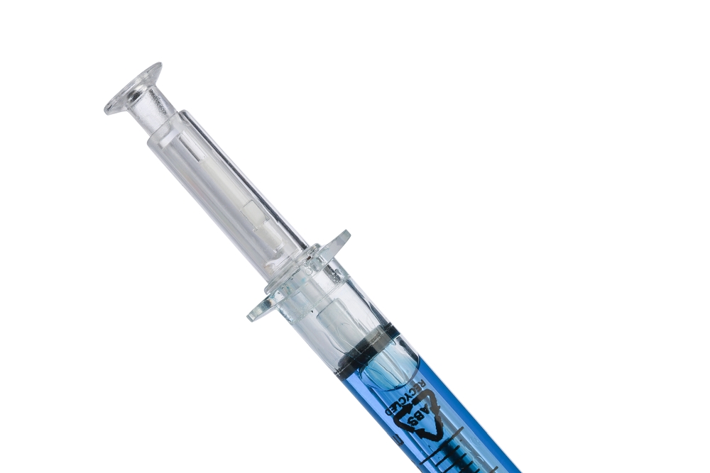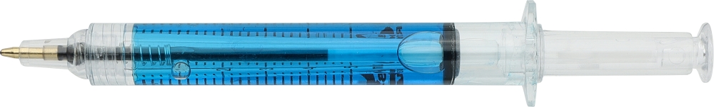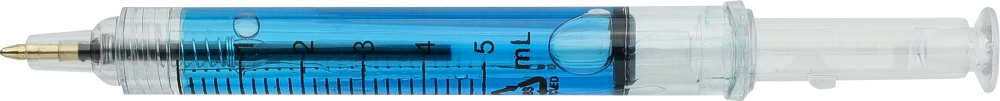 Propiska ve tvaru injekční stříkačky, naplněná barevnou tekutinou pro hravý a poutavý vzhled. Vyrobena z recyklovaného ABS plastu, čímž se snižuje množství plastového odpadu a zároveň si zachovává vysoká odolnost proti nárazu a dlouhotrvající životnost. Vybavena černou náplní a stiskacím mechanismem. Součástí je stylus pro použití na kapacitních dotykových obrazovkách. Povrchová úprava s vlitým logem z recyklovaného ABS plastu. Rozměry: 1,2 x 2 x 12,9 cm