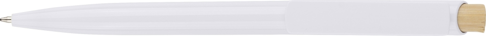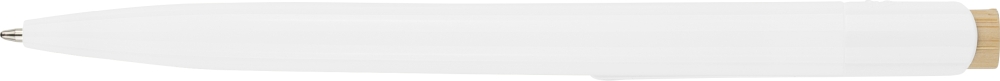 Propiska z recyklovaného ABS plastu s bambusovým tlačítkem a bílým klipem, vhodné pro digitální tisk. Přibližná délka psaní 600 metrů. Modrý inkoust. Rozměry: 1 cm x 1,4 cm x 14,4 cm.