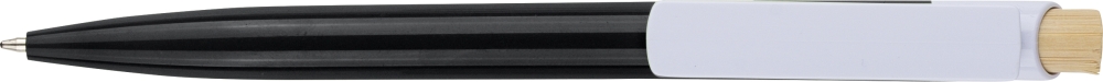 Propiska z recyklovaného ABS plastu s bambusovým tlačítkem a bílým klipem, vhodné pro digitální tisk. Přibližná délka psaní 600 metrů. Modrý inkoust. Rozměry: 1 cm x 1,4 cm x 14,4 cm.