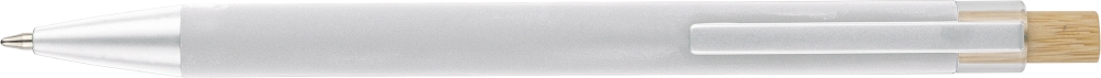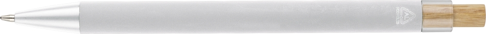 Propiska z recyklovaného hliníku s bambusovým tlačítkem a detailem z AS plastu. Součástí je kovový klip a plastový hrot, obojí ve sladěných barvách. Na těle je laserově gravírované recyklované logo. Přibližná délka psaní 800 metrů. Modrý inkoust. Rozměry: 1 cm x 1,25 cm x 14 cm.