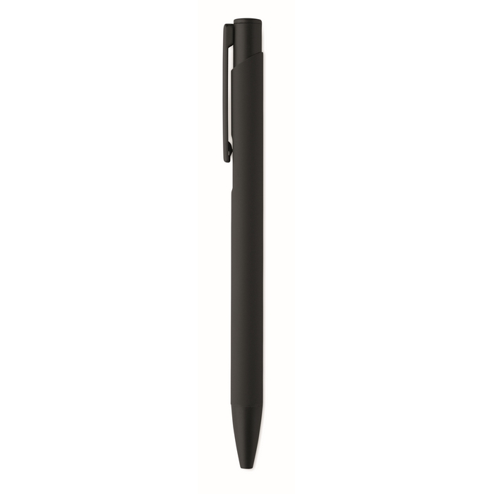 Tlačítková propiska z recyklovaného hliníku s železným klipem a barevným pogumovaným tělem. Modrý inkoust. Rozměry: 13.5 x 1.0 cm