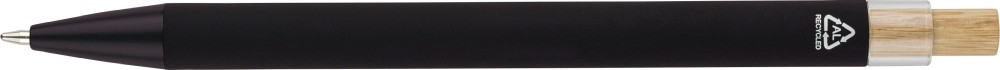 Propiska z recyklovaného hliníku s bambusovým tlačítkem a detailem z AS plastu. Součástí je kovový klip a plastový hrot, obojí ve sladěných barvách. Na těle je laserově gravírované recyklované logo. Přibližná délka psaní 800 metrů. Modrý inkoust. Rozměry: 1 cm x 1,25 cm x 14 cm.