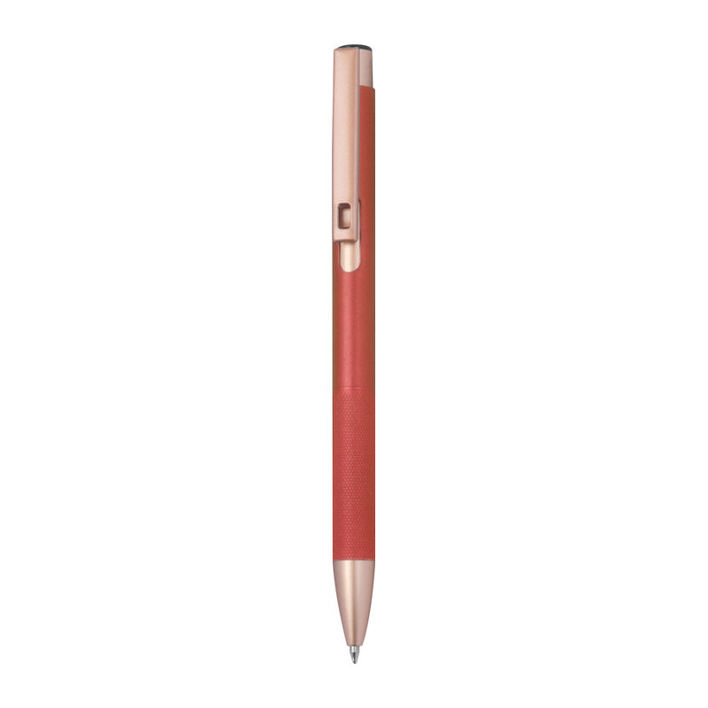 Propiska z recyklovaného hliníku s matným povrchem, růžovo-zlatými detaily, modrou náplní a úchopem s diamantovým vzorem. Rozměry: 14,2 x 1 cm