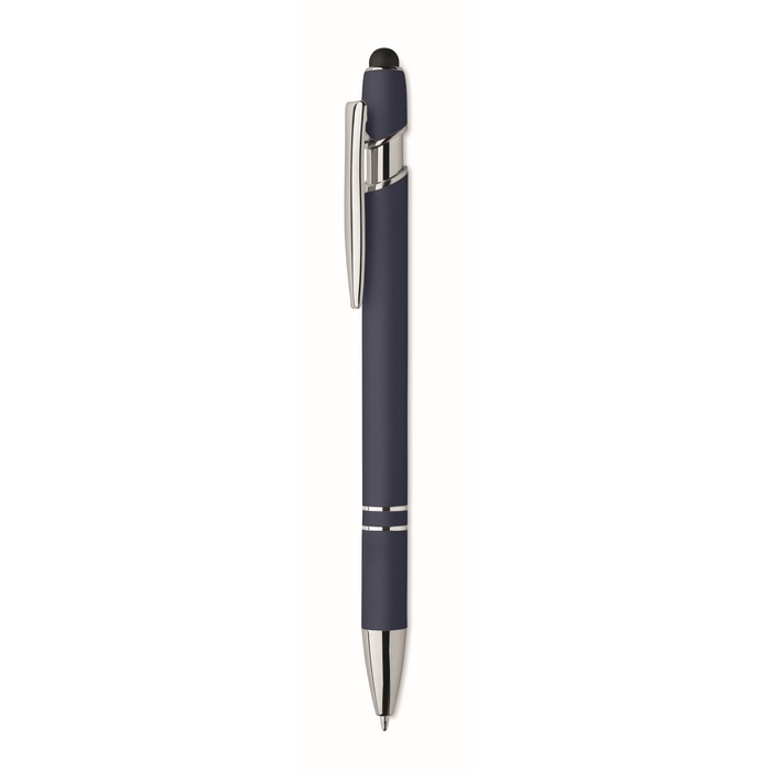 Kuličkové pero z recyklovaného hliníku, se stylusem. Modrý inkoust. Rozměry: 14 x 1 cm