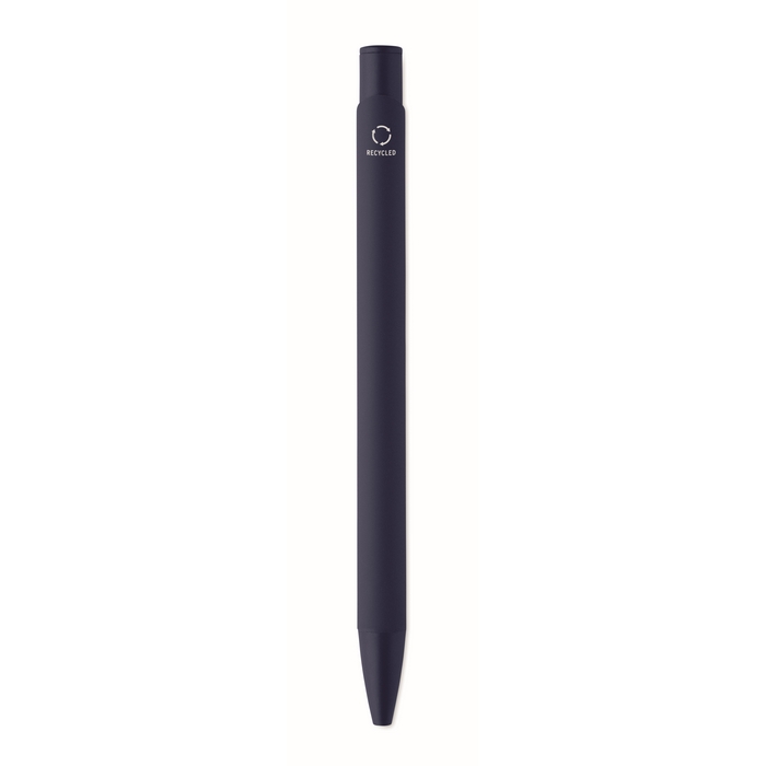 Tlačítková propiska z recyklovaného hliníku s železným klipem a barevným pogumovaným tělem. Modrý inkoust. Rozměry: 13.5 x 1.0 cm