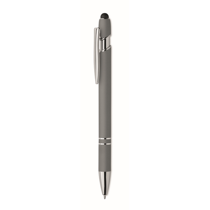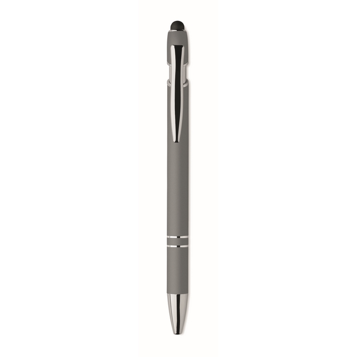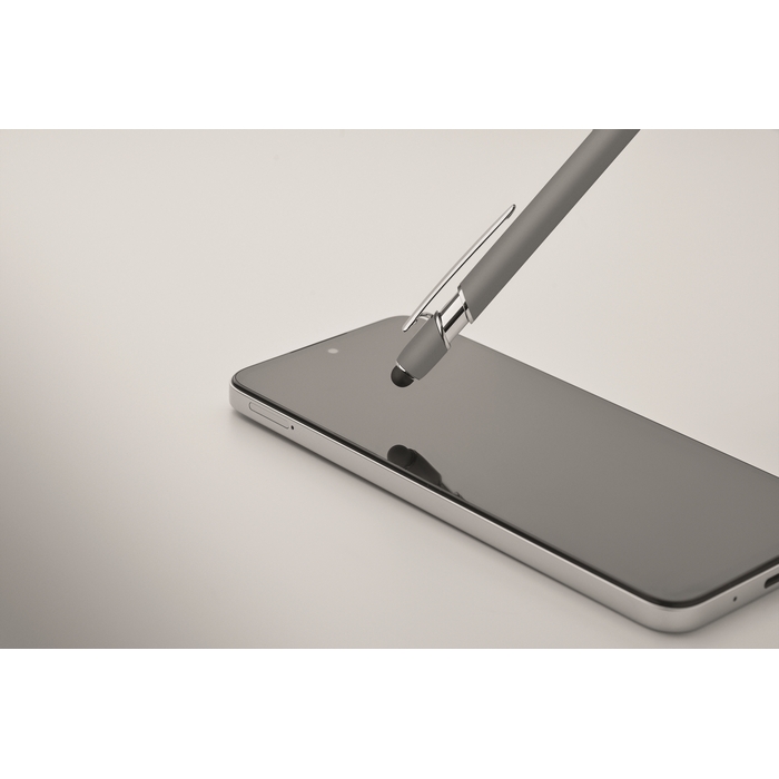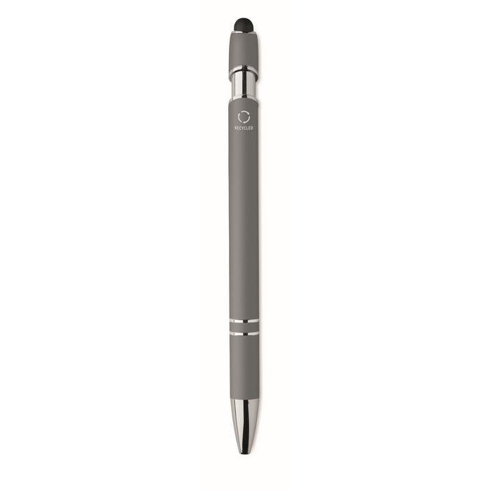 Kuličkové pero z recyklovaného hliníku, se stylusem. Modrý inkoust. Rozměry: 14 x 1 cm
