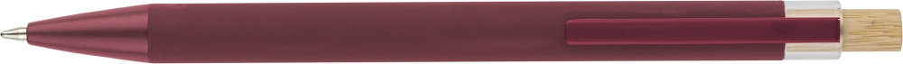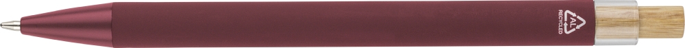 Propiska z recyklovaného hliníku s bambusovým tlačítkem a detailem z AS plastu. Součástí je kovový klip a plastový hrot, obojí ve sladěných barvách. Na těle je laserově gravírované recyklované logo. Přibližná délka psaní 800 metrů. Modrý inkoust. Rozměry: 1 cm x 1,25 cm x 14 cm.