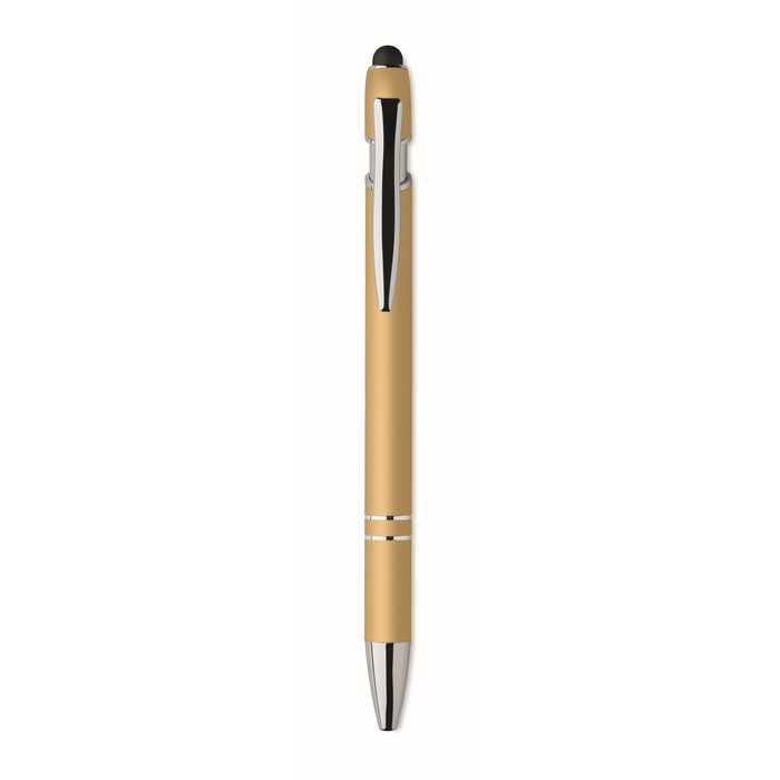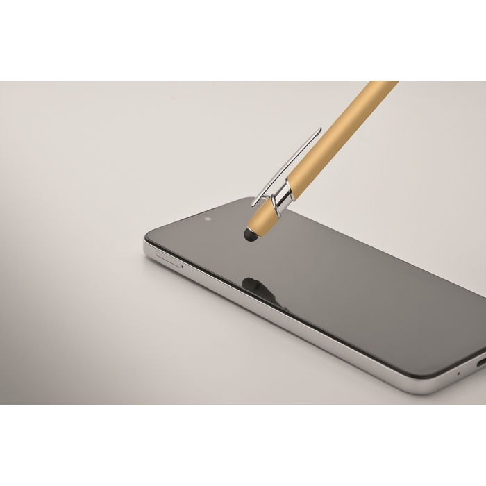Kuličkové pero z recyklovaného hliníku, se stylusem. Modrý inkoust. Rozměry: 14 x 1 cm