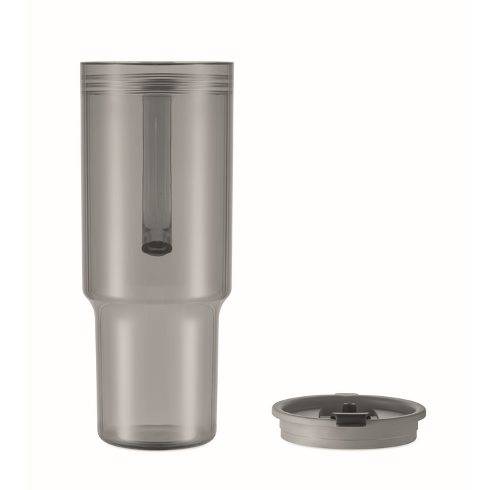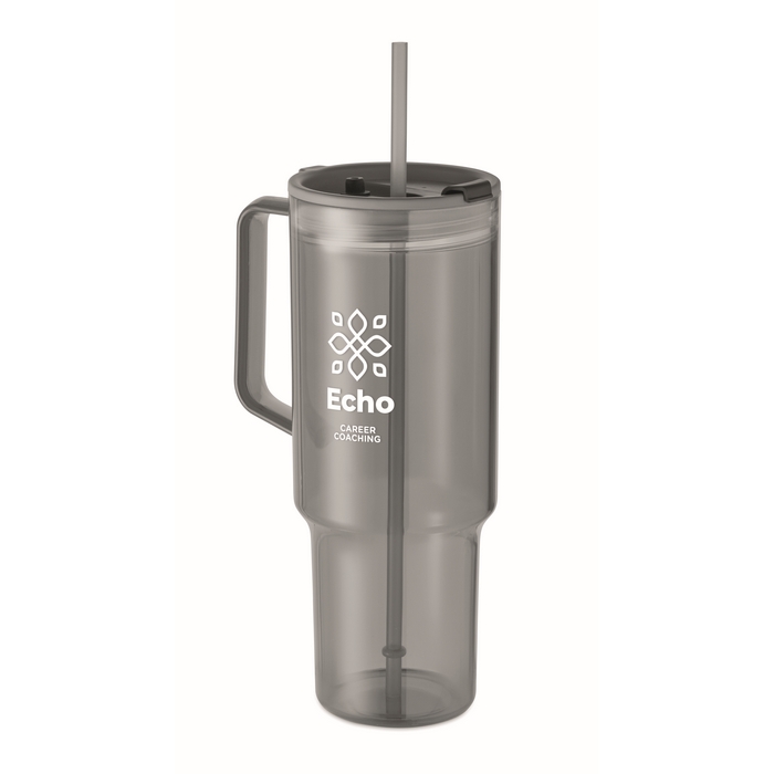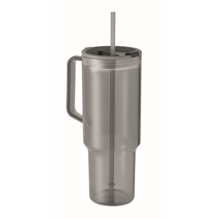 Průhledný hrnek z RPET s víčkem a PP brčkem. Objem: 1200 ml. Rozměry: 14,2 x 25,5 cm