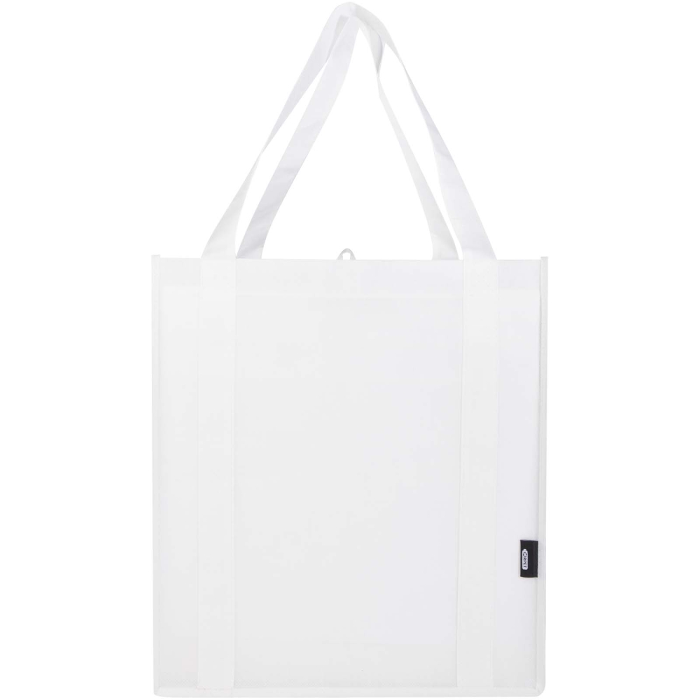 Recyklovaná nákupní taška vyrobená z odolného netkaného RPET má podpůrnou spodní desku, díky níž je univerzální a pevná. Nákupní taška má velkou hlavní přihrádku a ucha o délce 25 cm. Objemová kapacita: 29 litrů. Nosnost do 12 kg. Rozměry: 33 x 36 x 25,4 cm