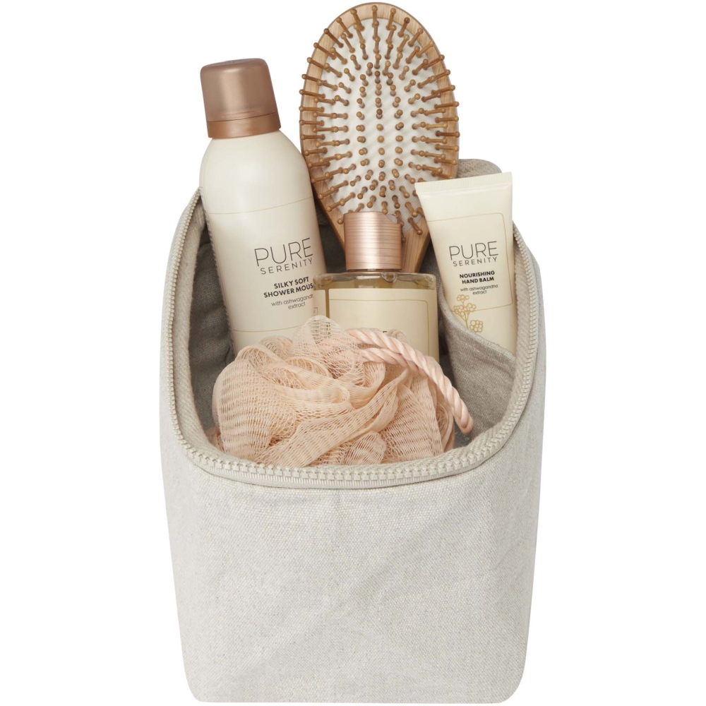 Organizér na toaletní potřeby vyrobený z 500 g/m2 recyklované bavlny a recyklovaného polyesteru s prostorným hlavním oddílem, bezpečným zapínáním na zip a několika vnitřními kapsami, díky čemuž se ideálně hodí pro ukládání nezbytných toaletních potřeb. Je navržen univerzálně, a hodí se tak k uspořádání malých předmětů, jako jsou ponožky nebo nabíječky, abyste měli ve svém zavazadle pořádek. Taška obsahuje recyklovaná vlákna, která používají předem vytříděný odpad určující barvu příze. Rozměry: 21,6 x 14 x 14 cm
