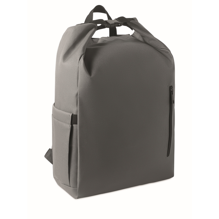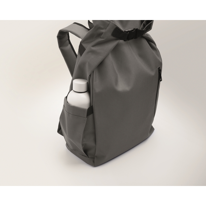 Rolovací batoh na 15 notebook z polyesteru 600D RPET s polstrovanou podšívkou z 210D RPET. Má přední kapsu na zip, elastickou boční kapsu a nastavitelné ramenní popruhy. Rozměry: 31 x 14 x 46 cm