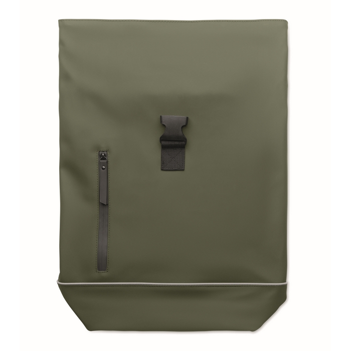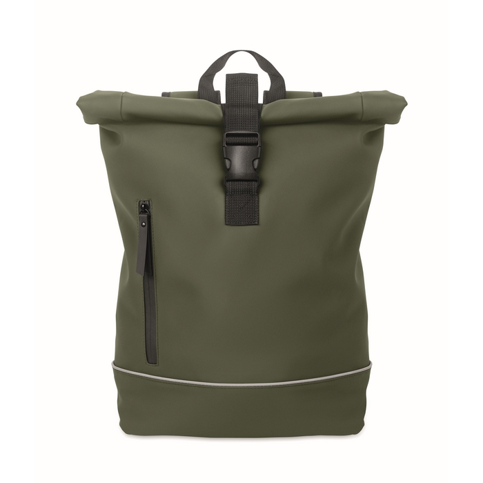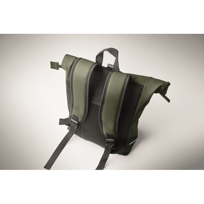Rolovací batoh na 15palcový notebook z měkkého PU s polstrovanými zády a zesílenou základnou s reflexním pruhem. Vodotěsná přední kapsa na zip. Podšívka z polyesteru 210D RPET. Rozměry: 40 x 12 x 54 cm