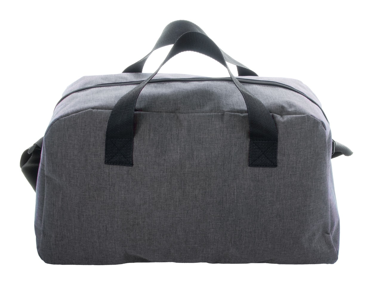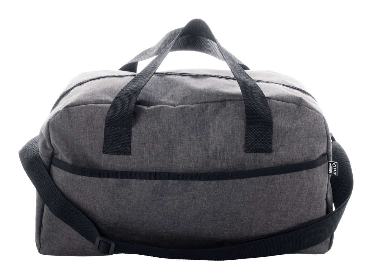 Sportovní taška z recyklovaného RPET polyesteru s přední kapsou, hlavní přihrádkou na zip a nastavitelným ramenním popruhem. Rozměry: 44 × 25 × 15 cm.