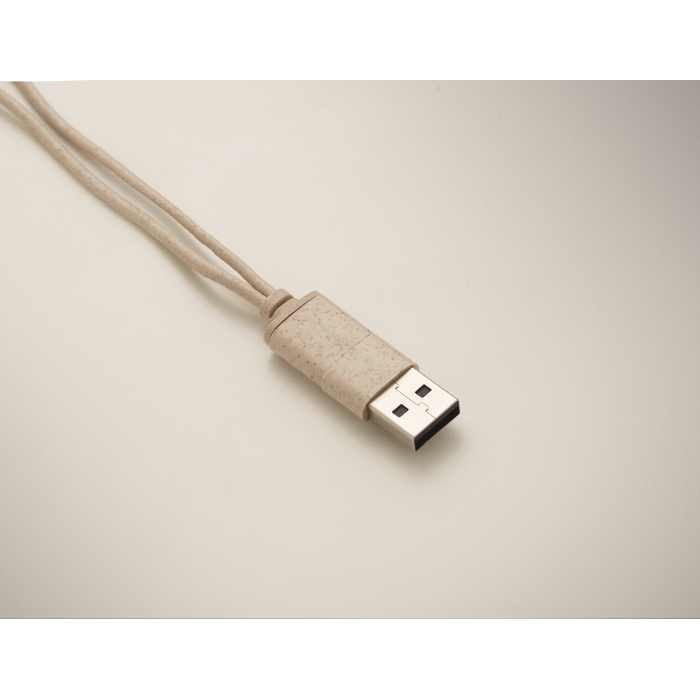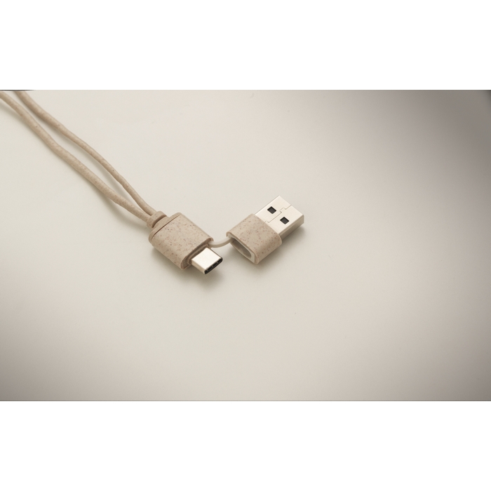 Sada kabelů v pouzdře z pšeničné slámy/ABS s bambusovým víčkem a karabinou. Víčko slouží zároveň jako stojánek pro telefon (ve vodorovné poloze). Vstup 2v1 USB-C/A, výstup Type-C. Rozměry: 6.4 x 3.4 x 6 cm