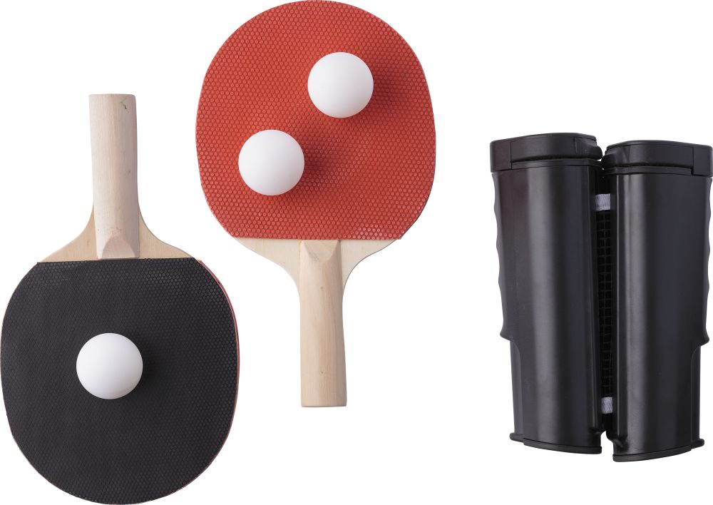 Sada pro stolní tenis, obsahuje 2 pálky, 3 pingpongové míčky a natahovací síťku. Baleno v sáčku z RPET. Rozměry: 30 × 22 x 0,5 cm.