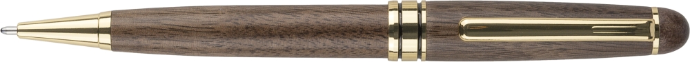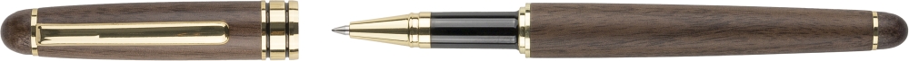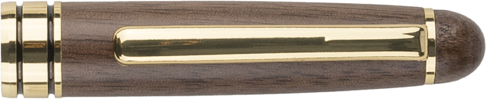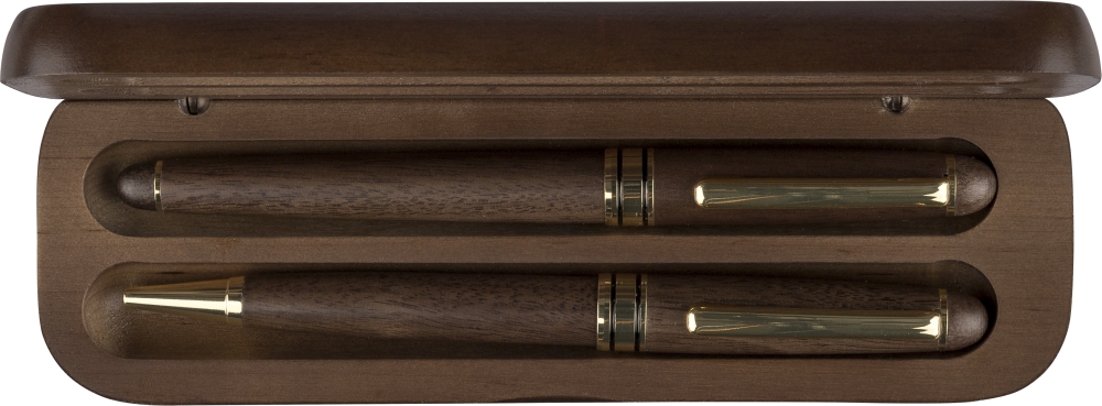 Sada per z ořechového dřeva a mosazi s otočným kuličkovým perem (cca 1 000 metrů) a rollerem (až 400 metrů), obě s modrým inkoustem. Kuličkové pero má kovový hrot, klip a lem. Baleno v javorové dřevěné krabičce a hnědé kartonové krabičce. Rozměry: 2,6 cm x 17,3 cm