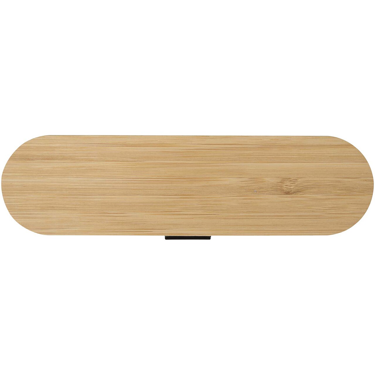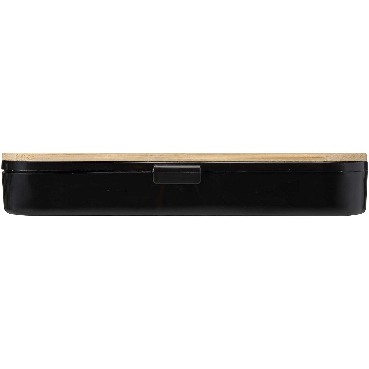 Sada opakovaně použitelného příboru s bambusovým víkem, která obsahuje vidličku, nůž, lžíci, brčko a čistič brčka – ideální pro stravování na cestách. Je kompaktní a snadno se čistí, takže je ideální k použití do svačinových boxů, při cestování nebo v kanceláři. Rozměry: 16,5 x 2,6 x 4,7 cm