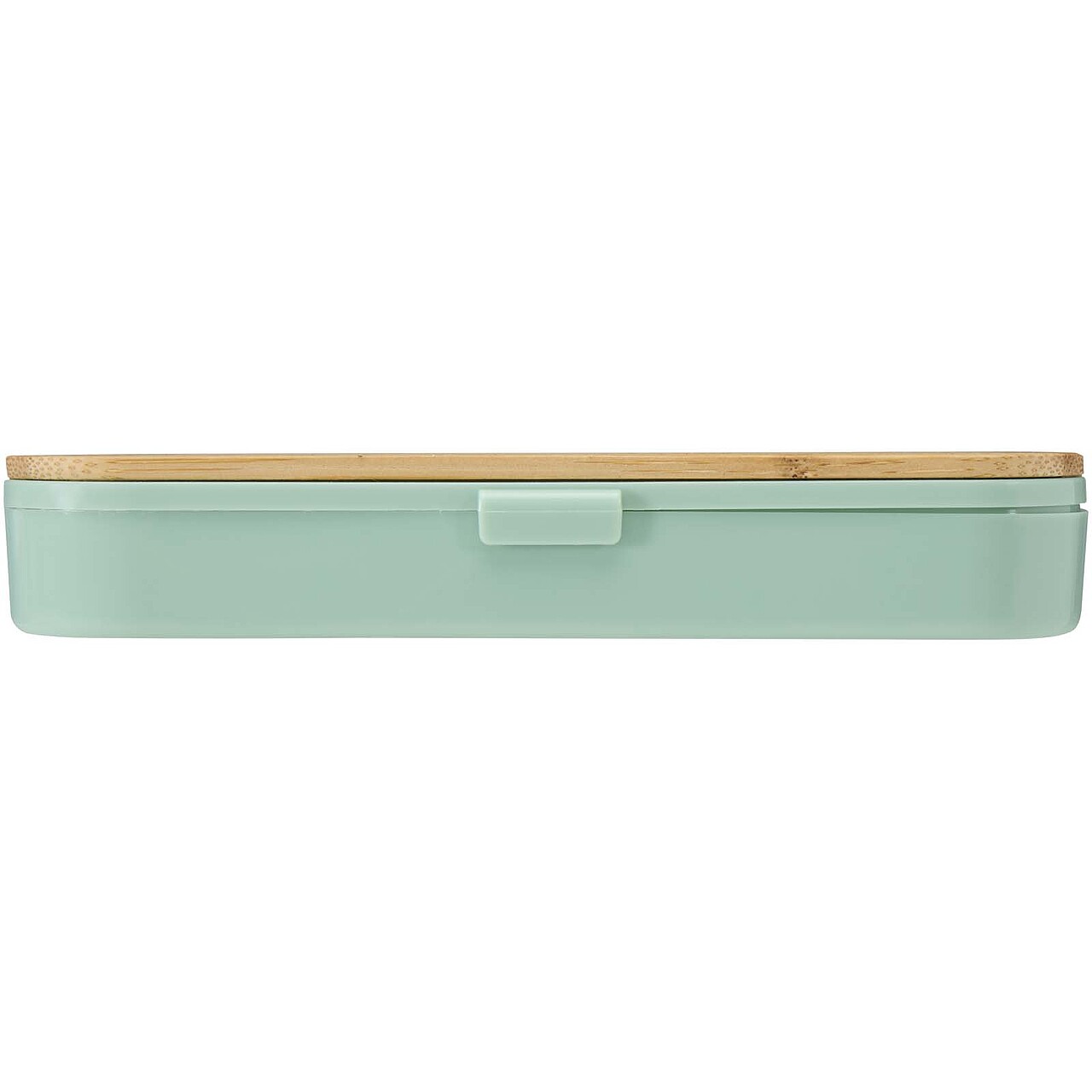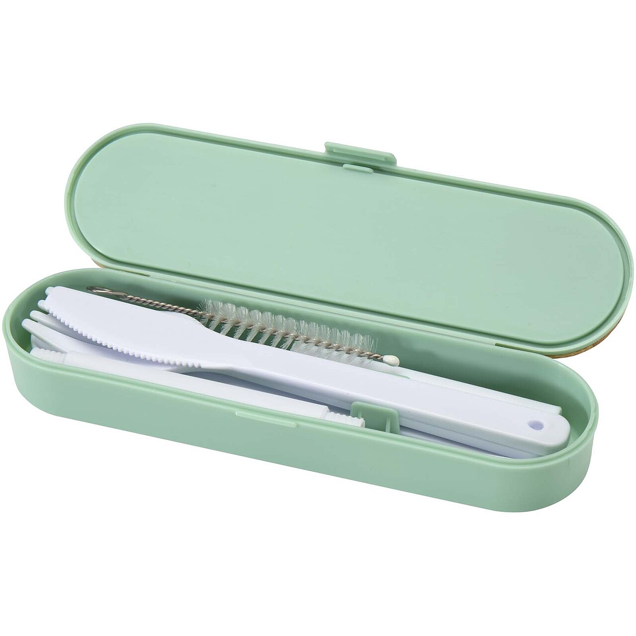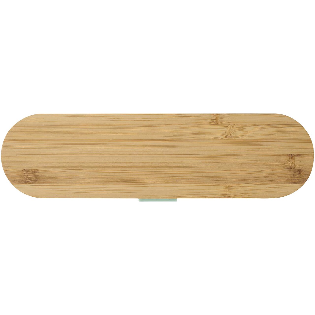 Sada opakovaně použitelného příboru s bambusovým víkem, která obsahuje vidličku, nůž, lžíci, brčko a čistič brčka – ideální pro stravování na cestách. Je kompaktní a snadno se čistí, takže je ideální k použití do svačinových boxů, při cestování nebo v kanceláři. Rozměry: 16,5 x 2,6 x 4,7 cm