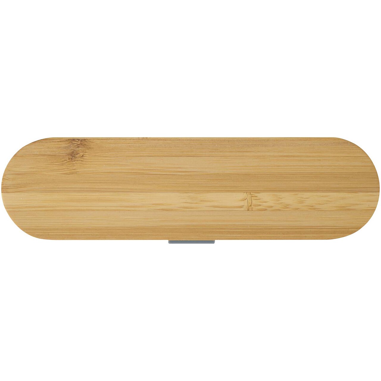 Sada opakovaně použitelného příboru s bambusovým víkem, která obsahuje vidličku, nůž, lžíci, brčko a čistič brčka – ideální pro stravování na cestách. Je kompaktní a snadno se čistí, takže je ideální k použití do svačinových boxů, při cestování nebo v kanceláři. Rozměry: 16,5 x 2,6 x 4,7 cm