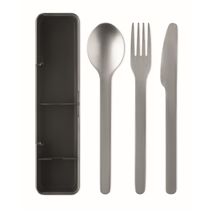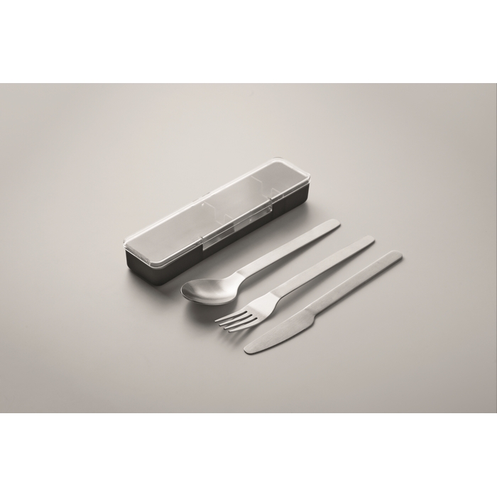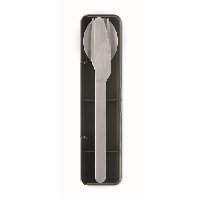 Sada příborů z nerezové oceli v pouzdru z PP. Obsahuje vidličku, nůž a lžíci. Rozměry: 19.5 x 5.2 x 2 cm