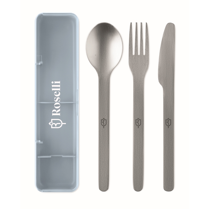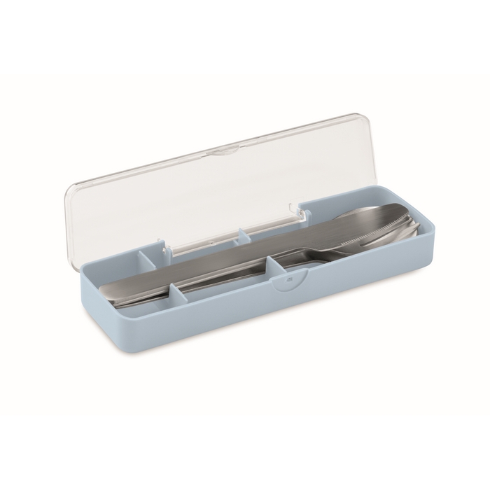 Sada příborů z nerezové oceli v pouzdru z PP. Obsahuje vidličku, nůž a lžíci. Rozměry: 19.5 x 5.2 x 2 cm