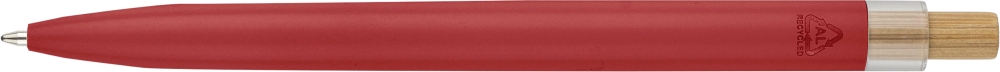 Sada lakovaných per z recyklovaného hliníku s kuličkovým a rollerovým perem. Bambusové tlačítko, rPET lem a kovový klip; roller obsahuje bambusový/rPET detail víčka a odpovídající klip. Obě pera s gravírovaným logem z recyklovaného materiálu. Píše přibližně 700 m (kuličkové pero) a 500 m (roller). Modrý inkoust. Baleno v barevné dárkové krabičce z recyklovaného kartonu. Rozměry: 1,4 cm x 17,8 cm