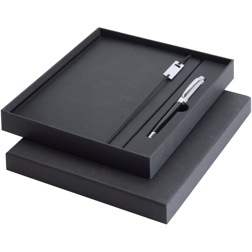 Sada elegantně kombinuje zápisník formátu A5 a kuličkové roller pero. Pero má horní část těla z recyklované mosazi se stříbrným chromovaným povrchem, spodní část těla s barevným nástřikem, kovové stříbrné chromované doplňky a logo LUXE na středovém kroužku. Barva inkoustu: Modrá. Délka psaní: 400 metrů. Rozměr hrotu: 0,7 mm. Součástí balení je i náhradní náplň v černé barvě. Zápisník má 80 listů linkovaného papíru o gramáži 80 g/m2, desky z recyklovaného plastu s imitací kůže, elastické zavírání, stuhu jako záložku a rozšiřitelnou kapsu. Stříbrný chromovaný kovový doplněk na elastickém zavírání. Baleno v dárkové krabičce z lepenky. Rozměry: 22,5 x 19,2 cm