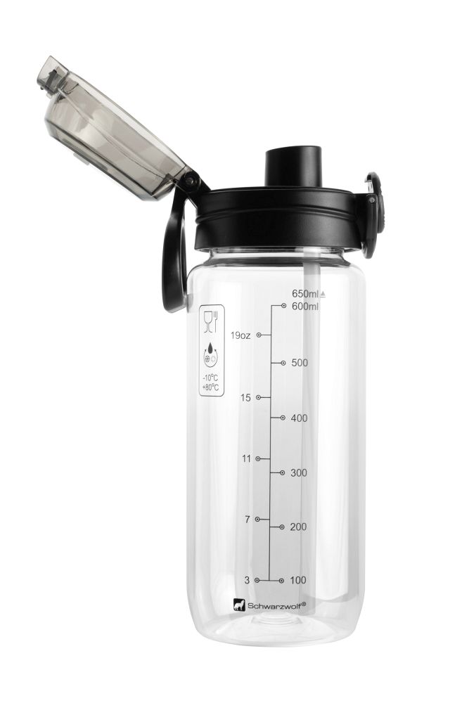 Športová tritánová fľaša značky Schwarzwolf v transparentnej farbe s čiernym viečkom. Fľaša má objem 650 ml a neobsahuje BPA, čím podporuje zdravý životný štýl. Ponúka 2 možnosti pitia: zabudovanú slamku a klasický náustok. Je vhodná pre studené aj horúce nápoje od -10 ° C do 80 ° C. Balené v darčekovej krabičke. Objem: 650 ml. Materiál: tritán. Rozmery: O 7,3 × 21,5 cm.