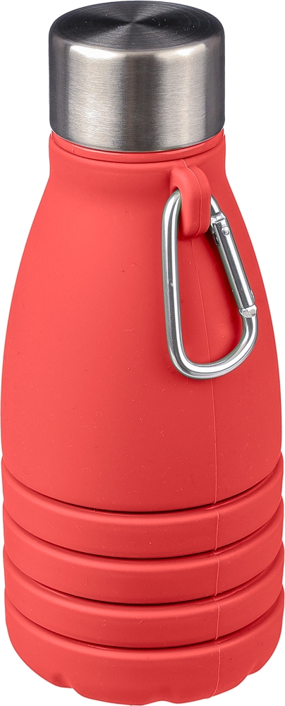 Silikonová skládací láhev na pití (550 ml) s víčkem z nerezové oceli a hliníkovou karabinou. Složená. Rozměry: 7 x 17 cm