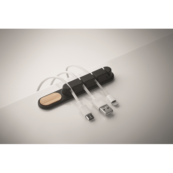 Silikonový organizér na kabely s detaily z přírodního bambusu. Kompaktní oválný design udržuje kabely bezpečné uklizené. Rozměry: 11 x 2 x 1.5 cm