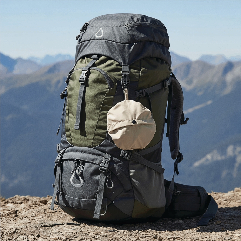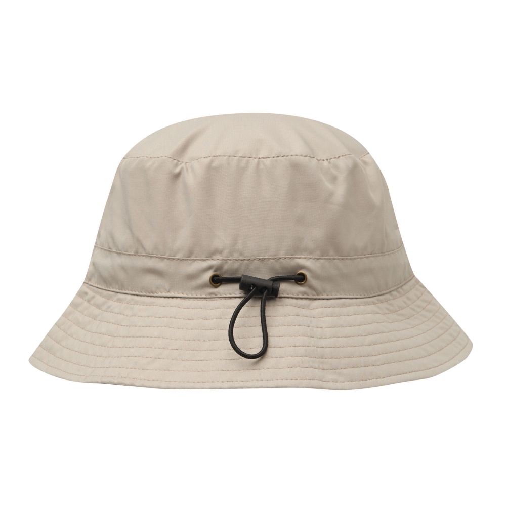 Skládací klobouk: vodoodpudivý, stahovací šňůrka s plastovou zarážkou pro nastavení obvodu hlavy, lze přeměnit na pouzdro pomocí patentního knoflíku, s karabinou.