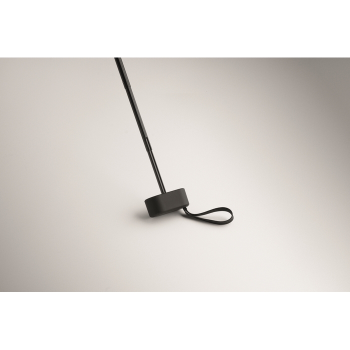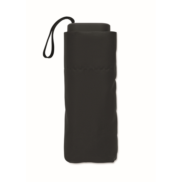 19palcový manuální skládací deštník z 190T pongee v obalu. Kovový a sklolaminátový větruodolný rám, černá pogumovaná rukojeť s popruhem na zápěstí. Kompaktní velikost, ve složeném stavu 17 cm. Rozměry: O90 x 17 cm