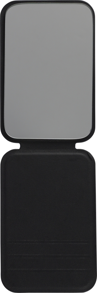 Skleněné zrcadlo se skládacím krytem z recyklovaného PU, navržené pro vzpřímené postavení po otevření. Kapesní velikost. Včetně reliéfního recyklovaného loga. Baleno v papírovém sáčku. Rozměry: 11 cm x 7 cm